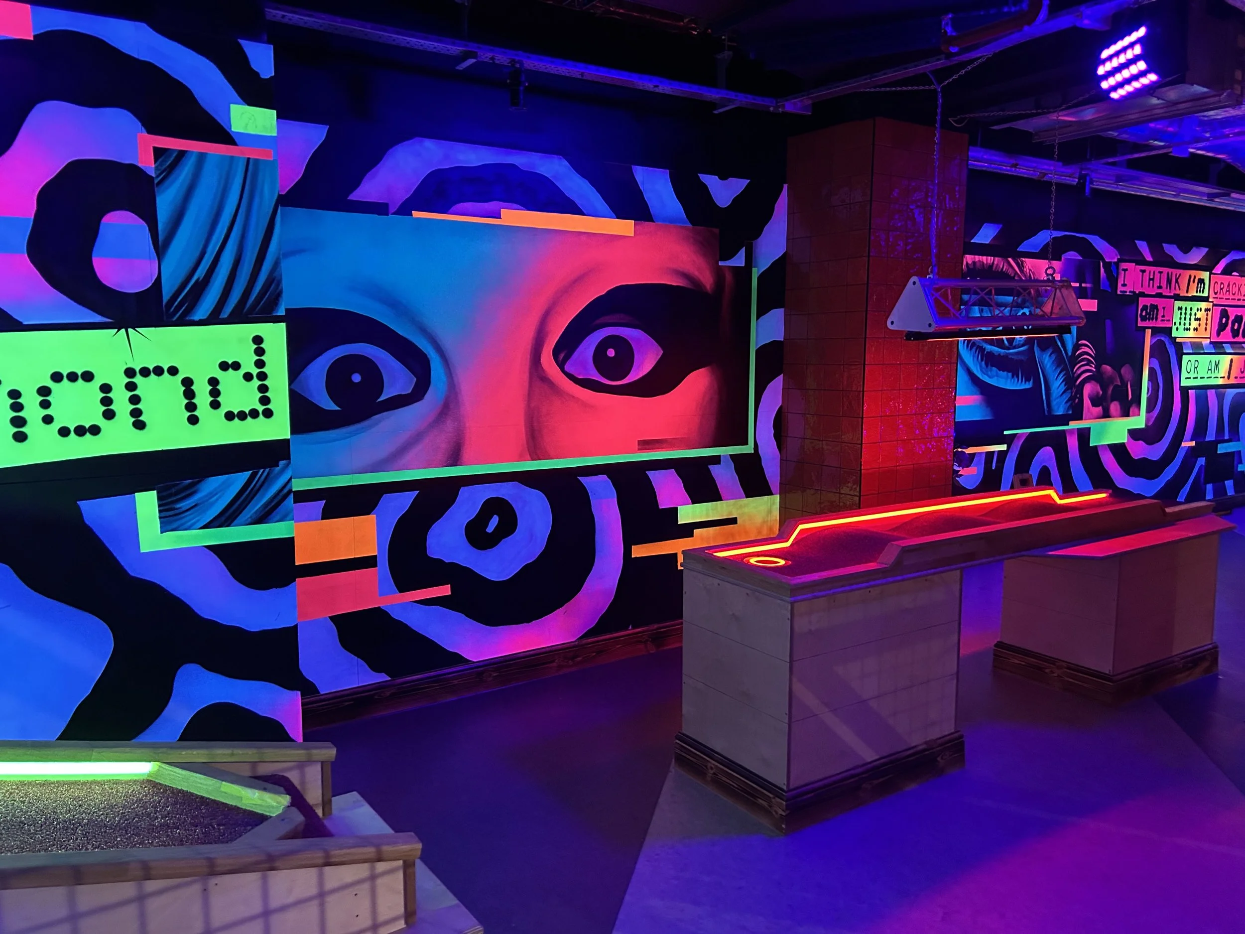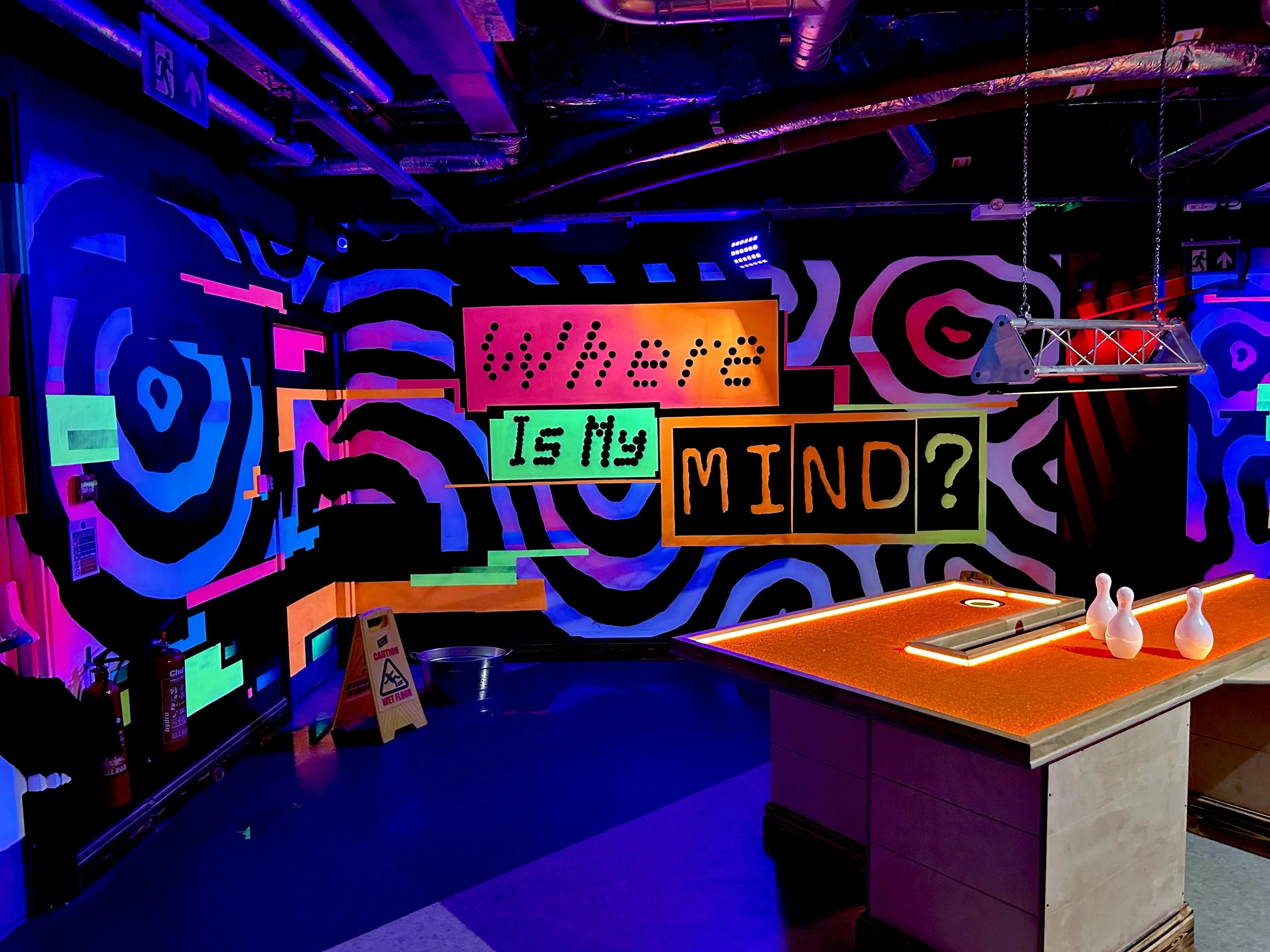 We design each area so it defines distinct environments within each venue. The Crazy Pool zone is consistently treated as a UV-led space, with graphics designed to set it apart from the rest of the building while remaining cohesive with the overall interior. This approach ensures each zone has its own identity, creating a clear, immersive experience across every site that features Crazy Pool.
