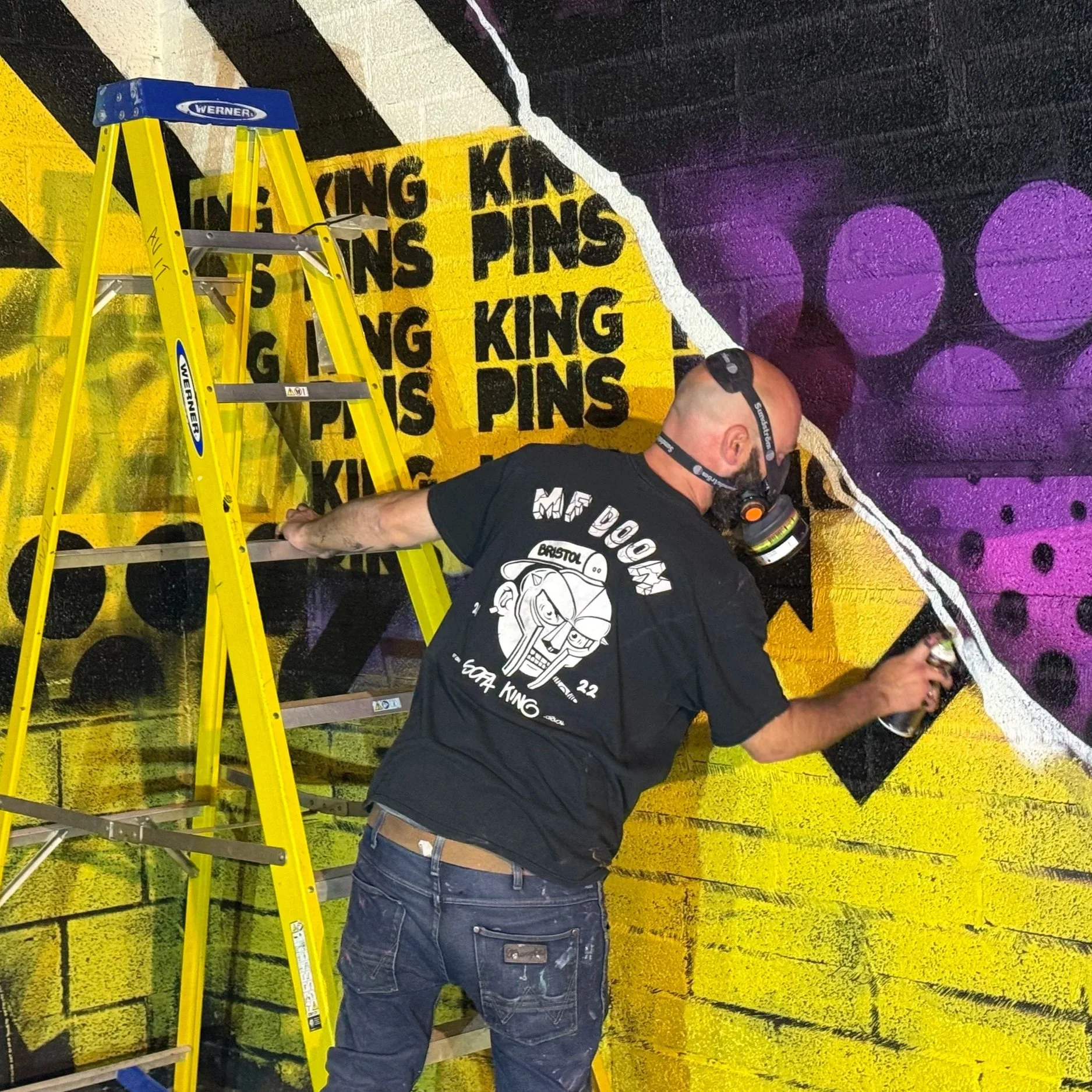 We work on large-scale, bespoke interior spray-painted murals for venues, bars, and entertainment spaces. Recently, I painted the interiors for Kingpins, a new venue that has just opened in Belfast, collaborating with fellow artist Eject.