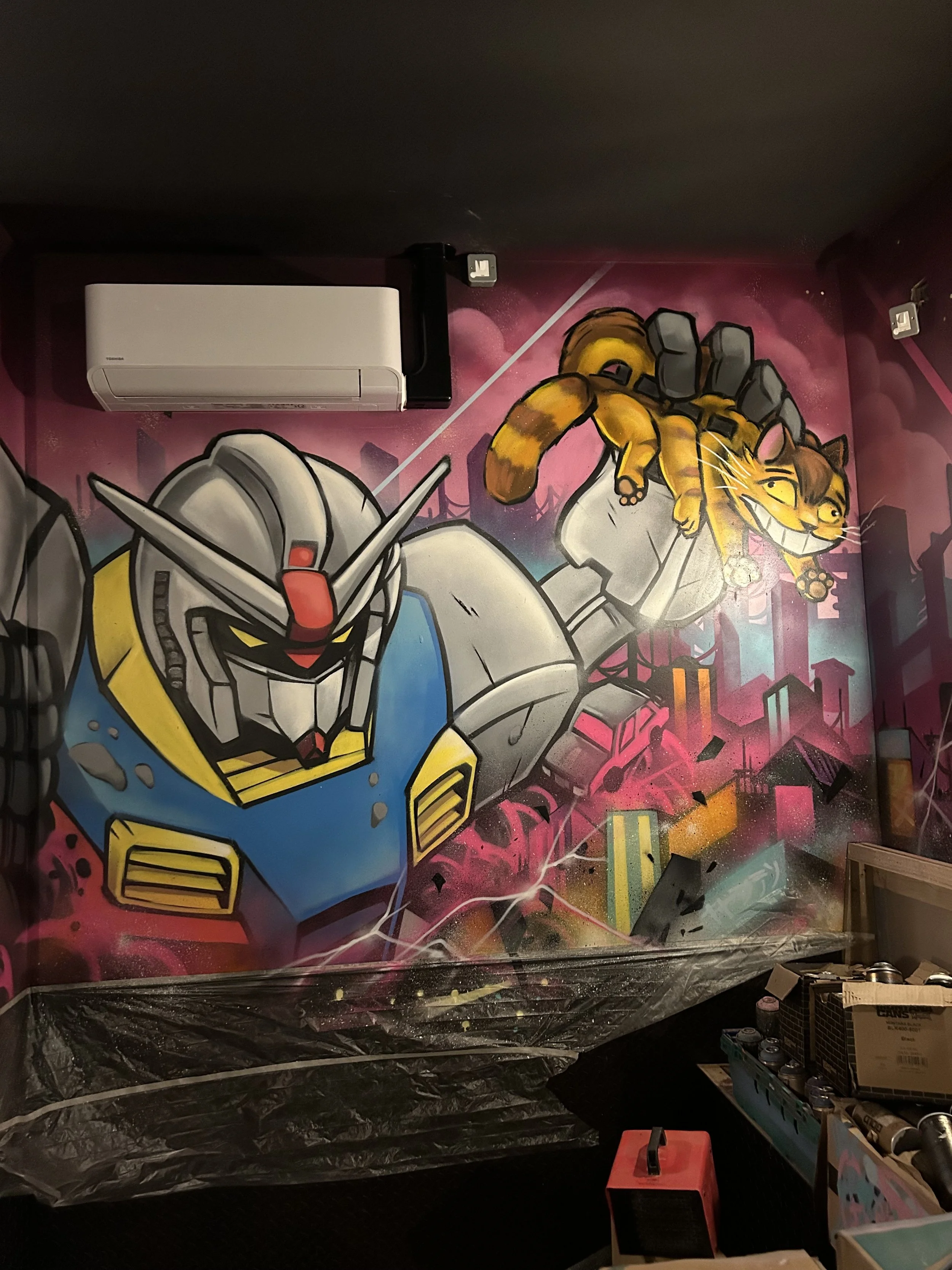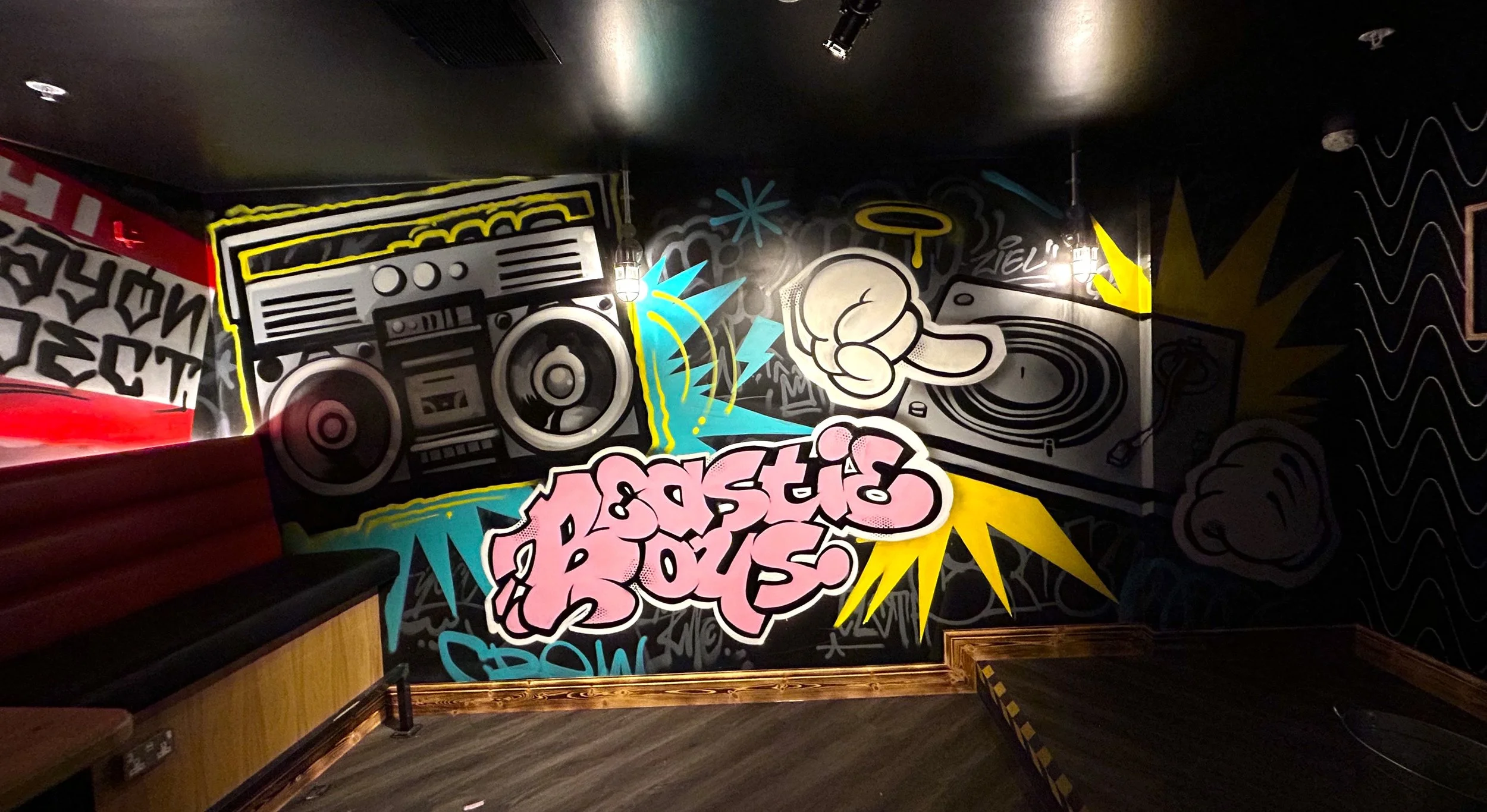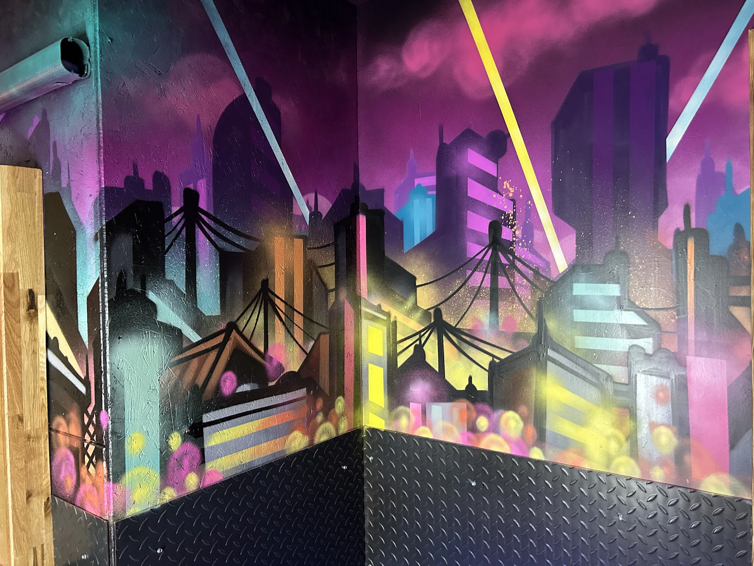 I have been painting Murals in the interiors of Roxy pretty much full time for the last four years . I’ve painted sites in Bristol, Edinburgh, Sheffield, Birmingham, Cardiff, Leeds, Manchester, York, Leicester, Liverpool, Cheltenham , Nottingham….and a few others i’ve definitely forgotten…... I have been with Eject, as a glorified assistant and emotional support guru; as we paint 12 hour days ;often till 5 o’clock in the morning. A lot of the ground work with design and concept art have been carved out over the many years before I came on to the project, but every wall we paint is completely unique with a lot of creative freedom. Together, we spend roughly 8 weeks painting in these sites and there really are no photos that do any justice to the amount of work that goes into creating these builds. Below are a few photos/videos of the sites . You can find your local Roxy here https://roxyleisure.co.uk/ and make sure to go check out Ejects artwork here https://demonsinthedetails.com